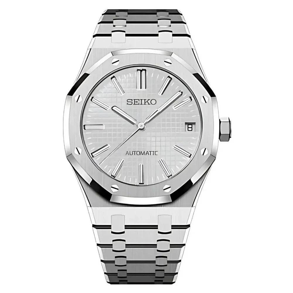 Inspired by the iconic Royal Oak design, and featuring the prestigious Seiko NH35 automatic movement, we present the Seikoroyal mod. A 41 mm high quality watch combining the perfect alliance between excellence and accessibility.