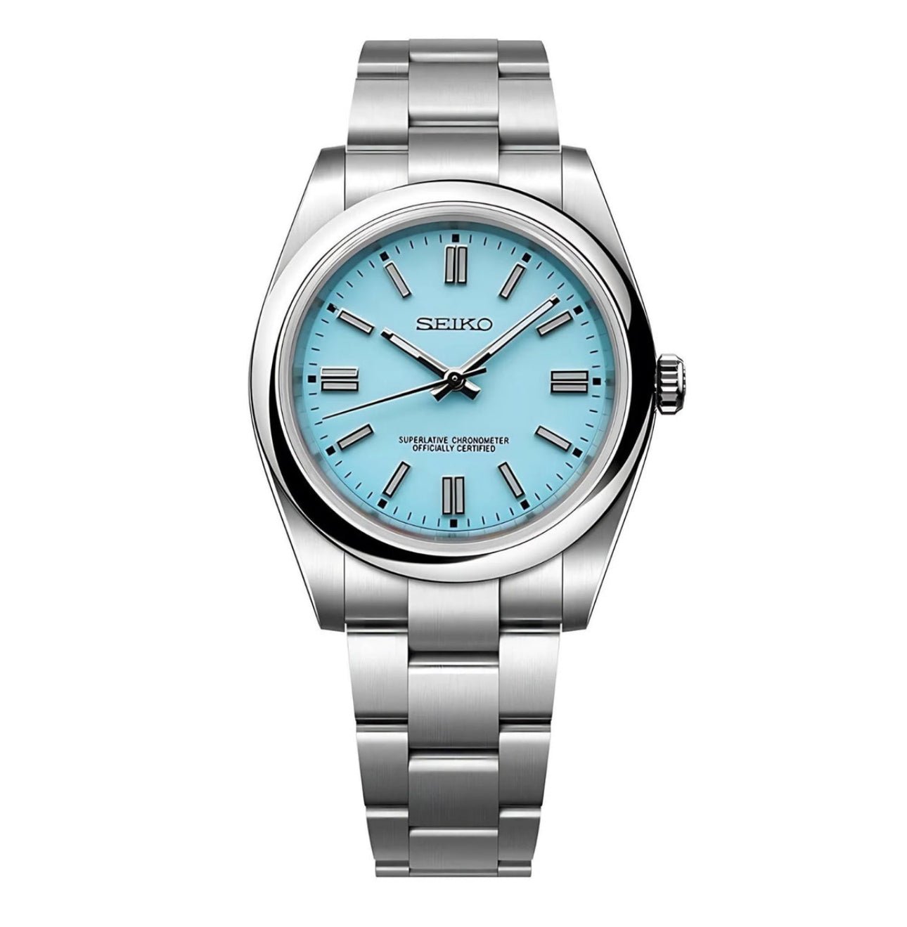 Discover the Seiko Mod Datejust Oyster Tiffany Blue, a meticulously crafted NH35 Automatic Watch, inspired by the iconic Datejust design. This elegant timepiece features a Tiffany Blue aftermarket dial, encased in a 36 mm or 39 mm fluted bezel, offering a blend of style and precision for watch enthusiasts.