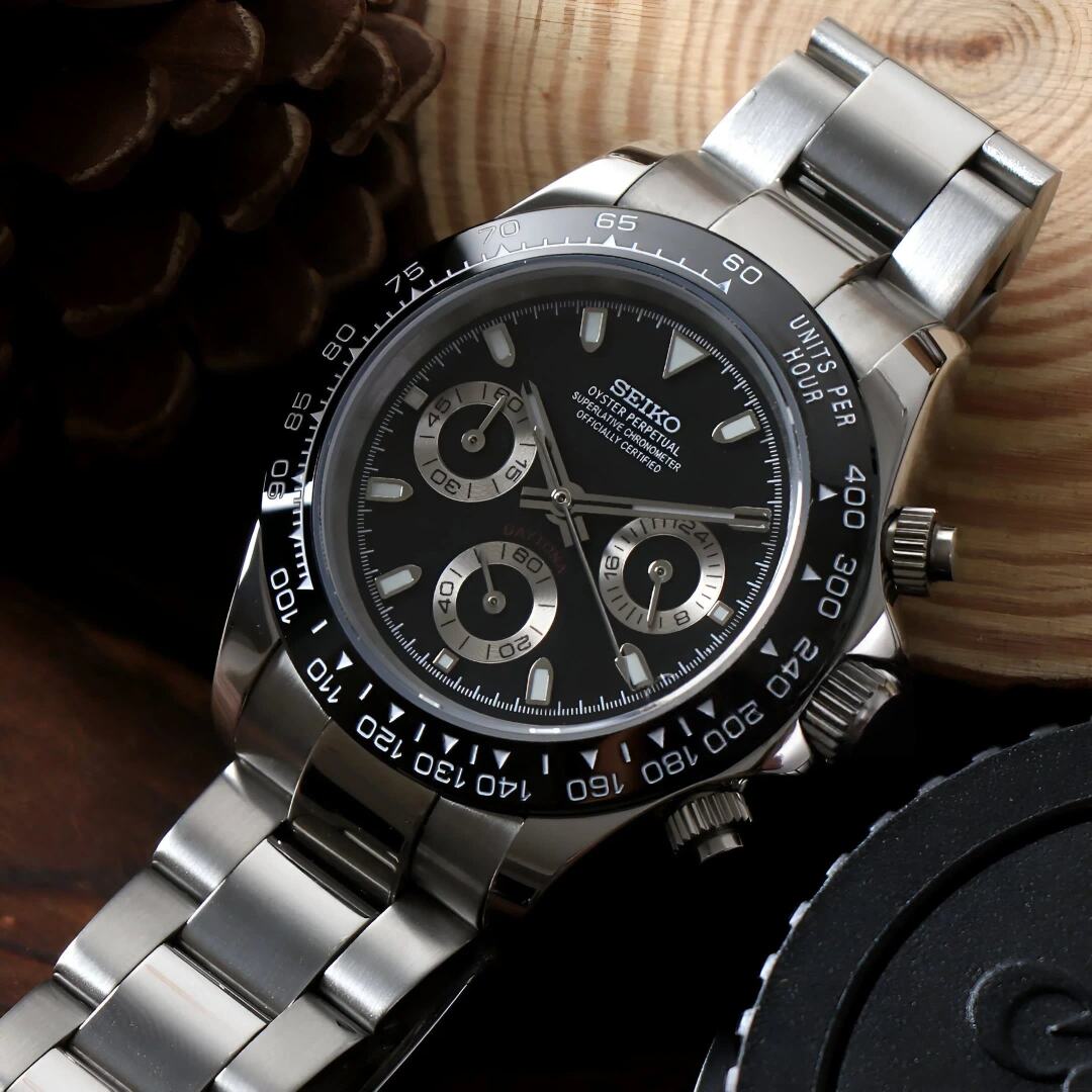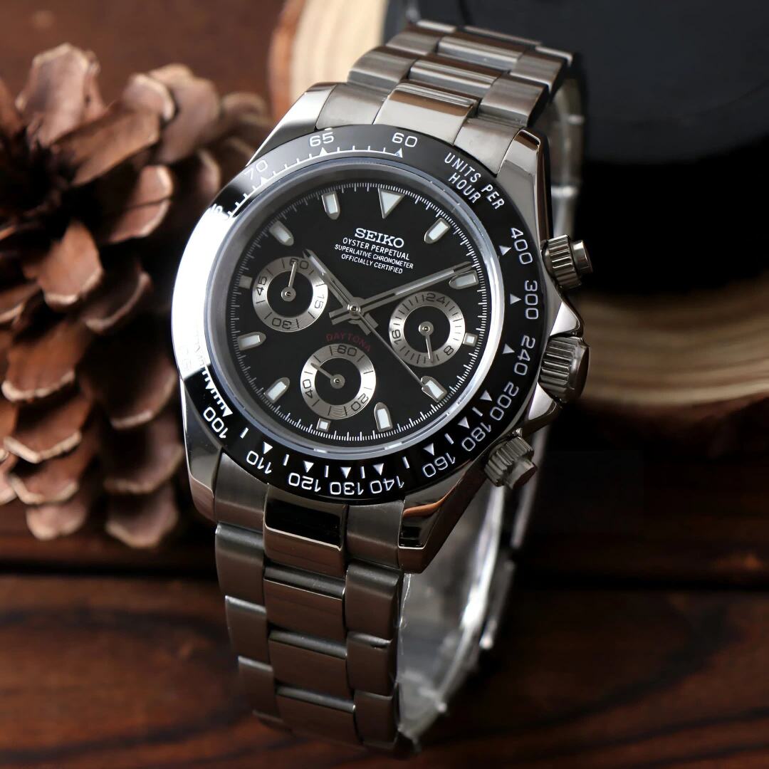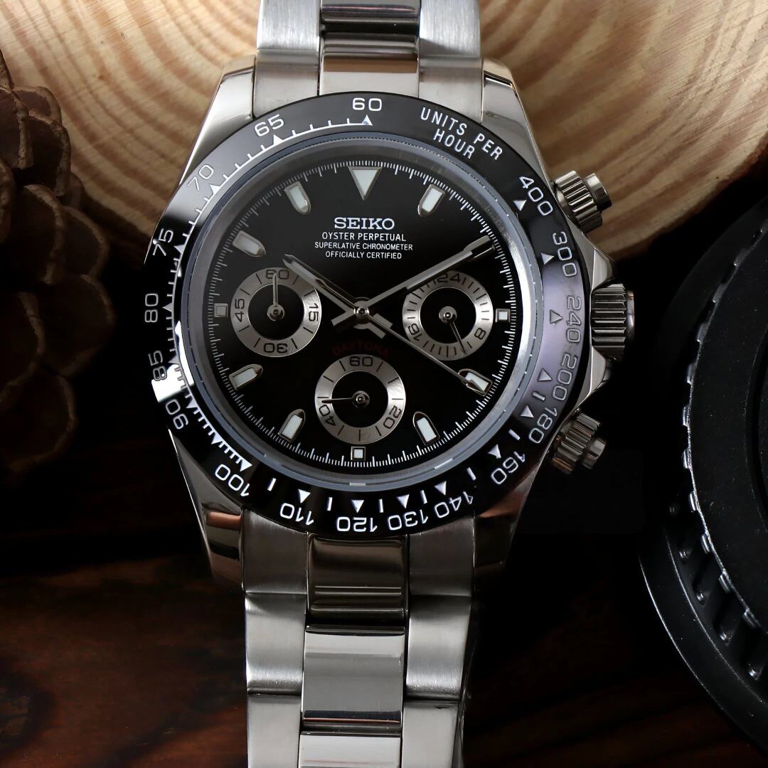 Elevate your style with the Daytona Black Ceramic, a custom Seiko VK63 Mechanical Quartz Watch, inspired by the iconic “Daytona” design. This unique timepiece features a Black Ceramic dial, encased in a 40mm stainless steel frame, offering a blend of elegance and precision for watch enthusiasts.