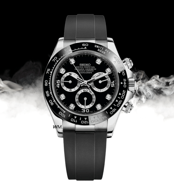 Elevate your style with the Daytona Black Gem , a custom Seiko VK63 Mechanical Quartz Watch, inspired by the iconic “Daytona” design. This unique timepiece features a Black Gem dial, encased in a 40mm stainless steel frame, offering a blend of elegance and precision for watch enthusiasts.