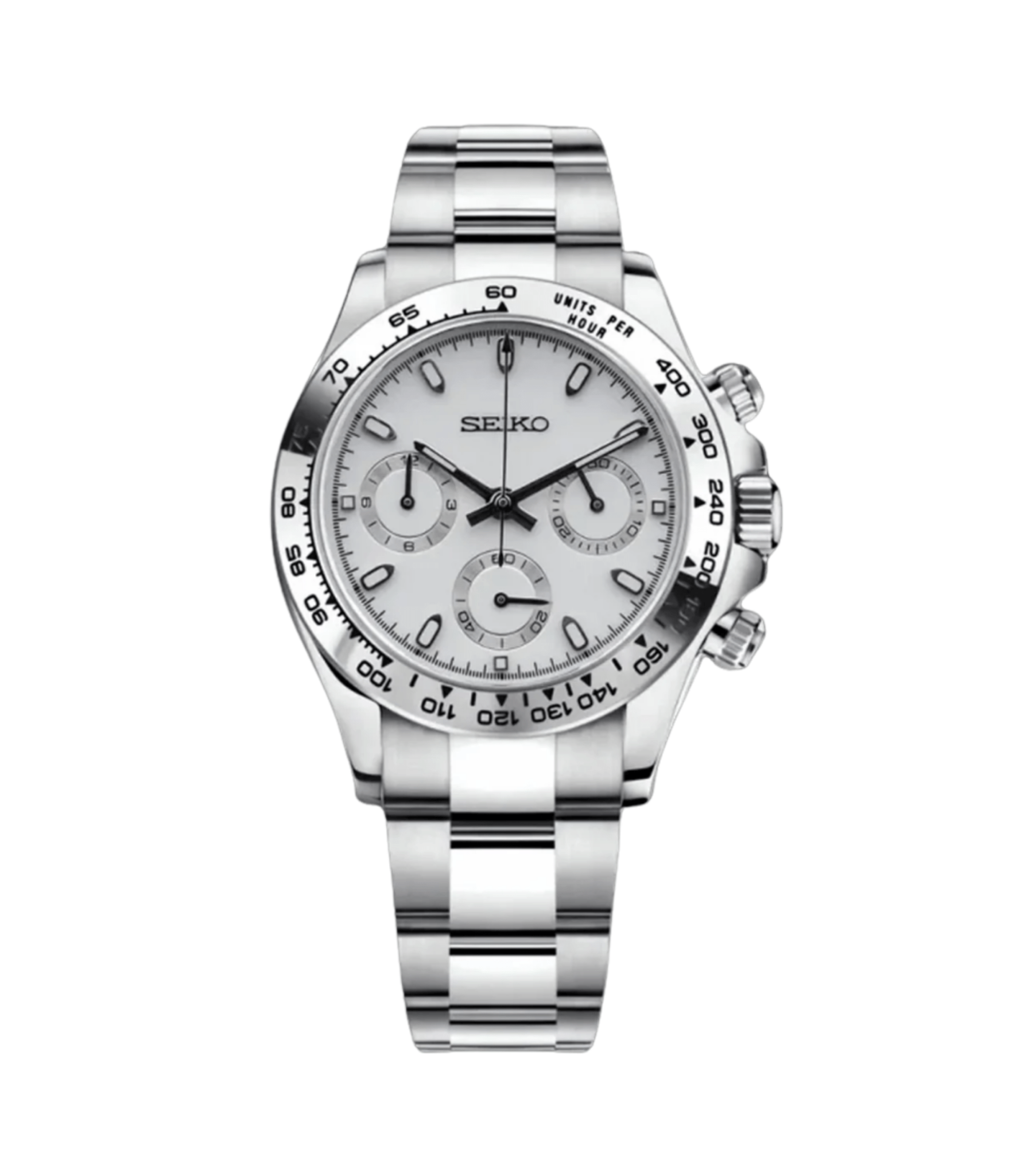 Elevate your style with the Seiko Mod Daytona Ceramic White, a custom Seiko VK63 Mechanical Quartz Watch, inspired by the iconic “Daytona” design. This unique timepiece features a Panda dial, encased in a 40mm stainless steel frame, offering a blend of elegance and precision for watch enthusiasts.