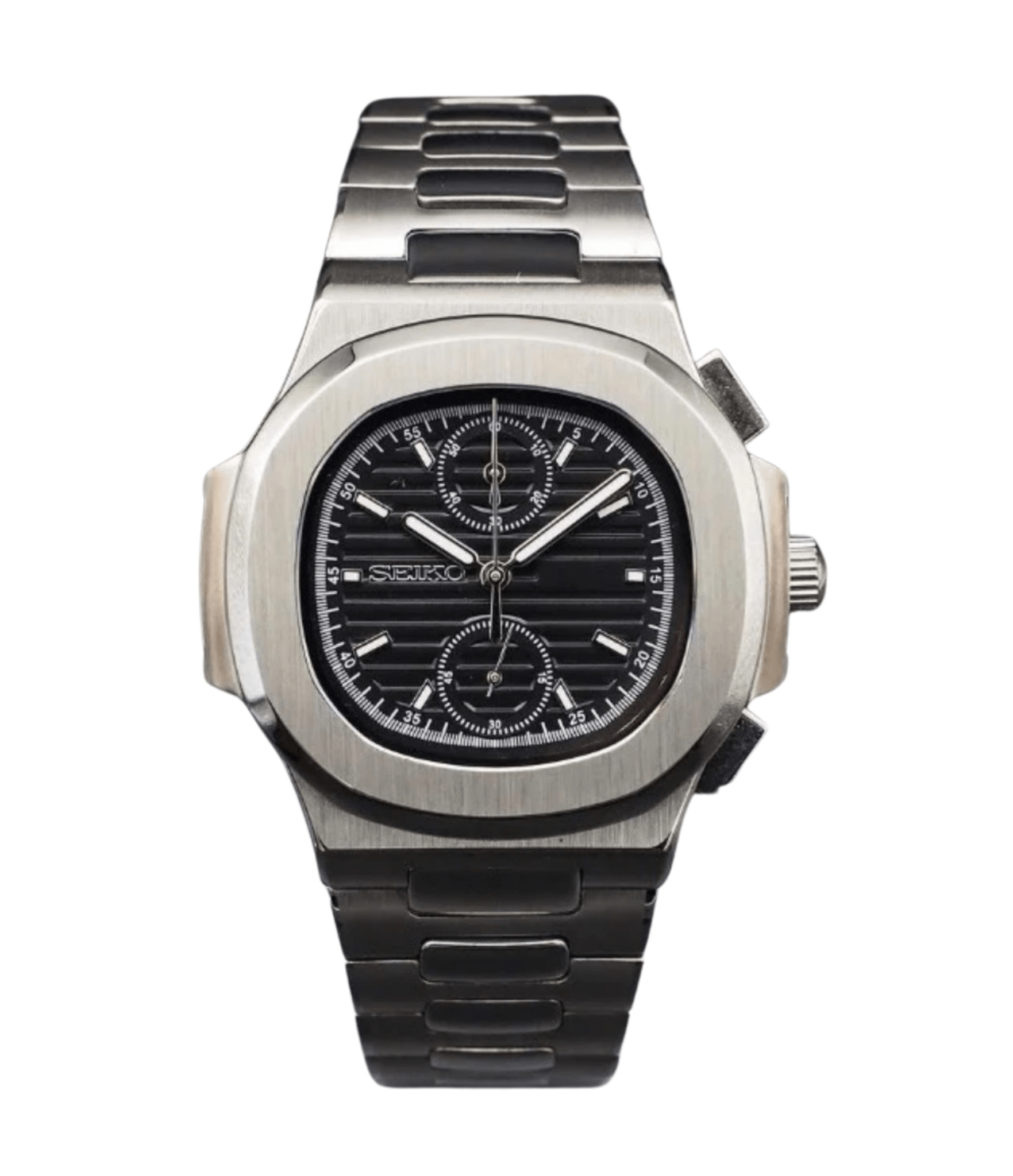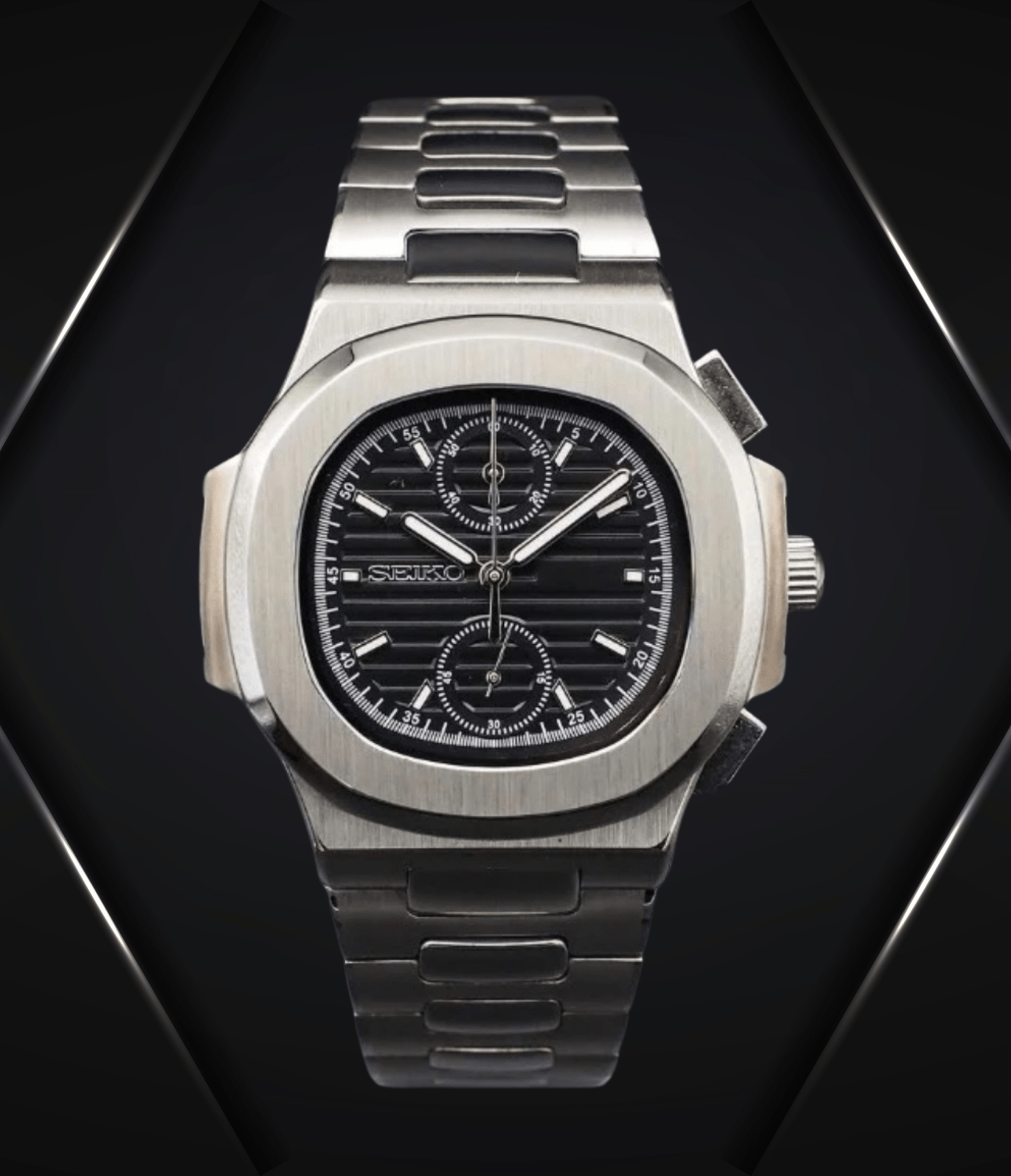Introducing the Nautilus Black Chronograph, a custom Seiko VK61 Automatic Watch inspired by the iconic Nautilus design, meticulously crafted for those who appreciate elegance and precision. This model features an Black Chronograph aftermarket dial and a transparent back piece, allowing a glimpse into the intricate automatic movement.
