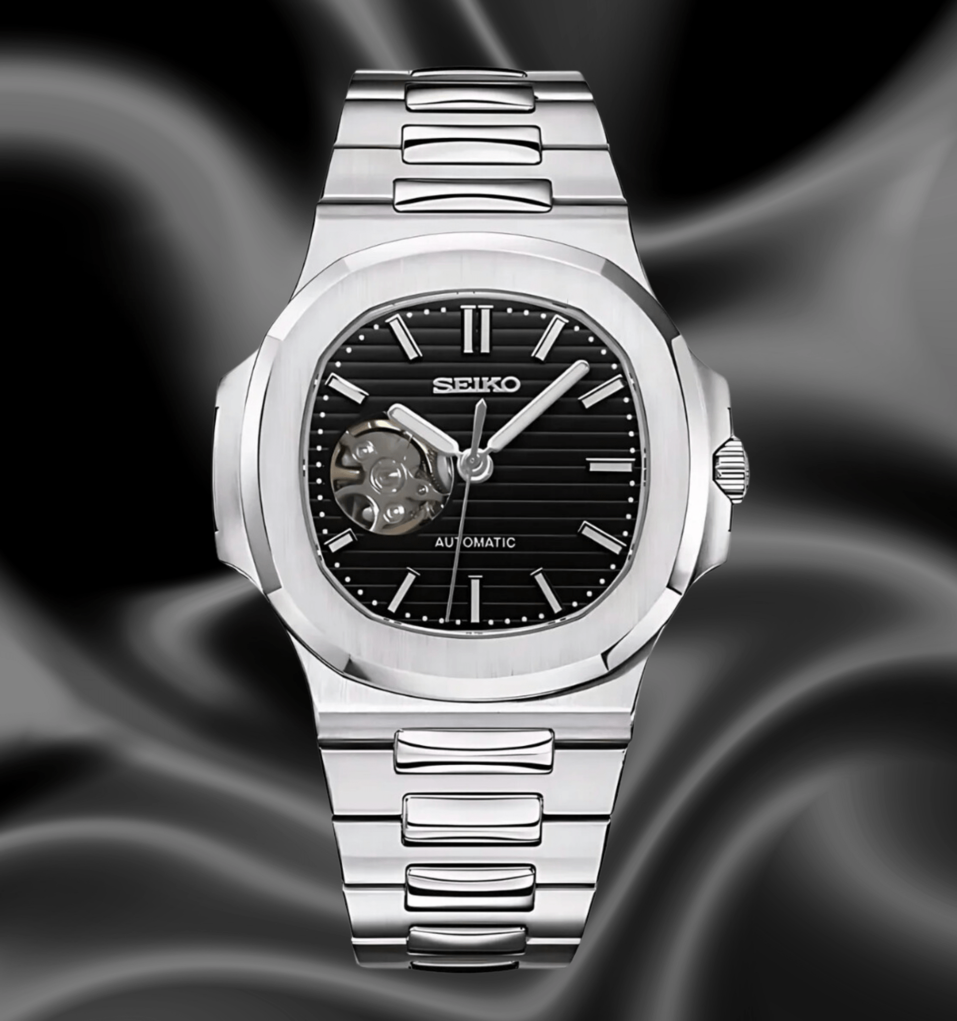 Introducing the Seiko Mod Nautilus (Open Heart) Silver Black, a custom Seiko NH34 Automatic Watch inspired by the iconic Nautilus design, meticulously crafted for those who appreciate elegance and precision. This model features a Black aftermarket dial and a transparent back piece, allowing a glimpse into the intricate automatic movement.