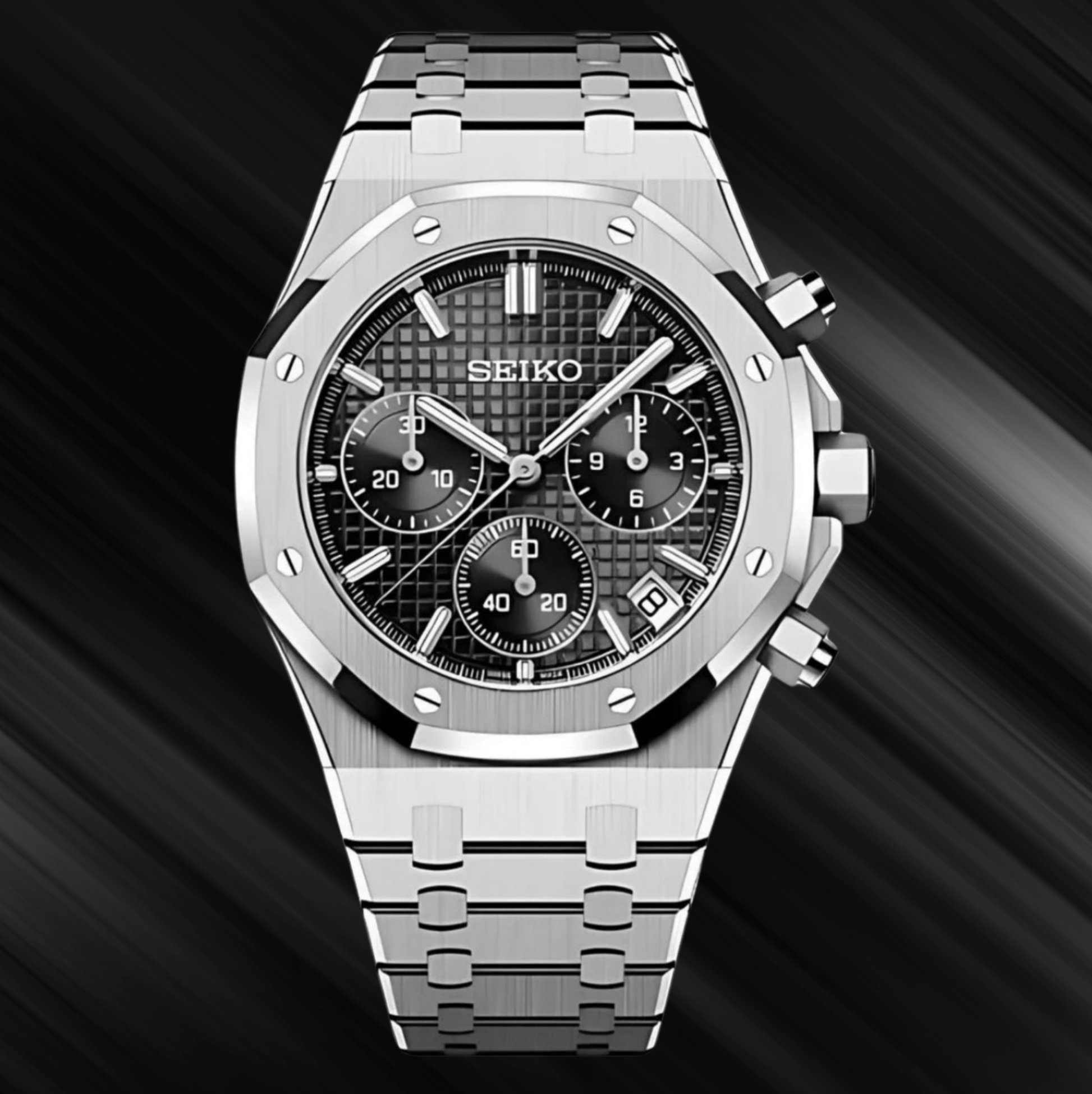 Introducing the Seiko Mod Royal Oak Chronograph Black, a custom Seiko VK63 Quartz Mechanical Movement inspired by the iconic Royal Oak design, meticulously crafted for those who seek elegance and precision. This model features a Chronograph Black aftermarket dial and a transparent back piece, allowing a glimpse into the intricate automatic movement.