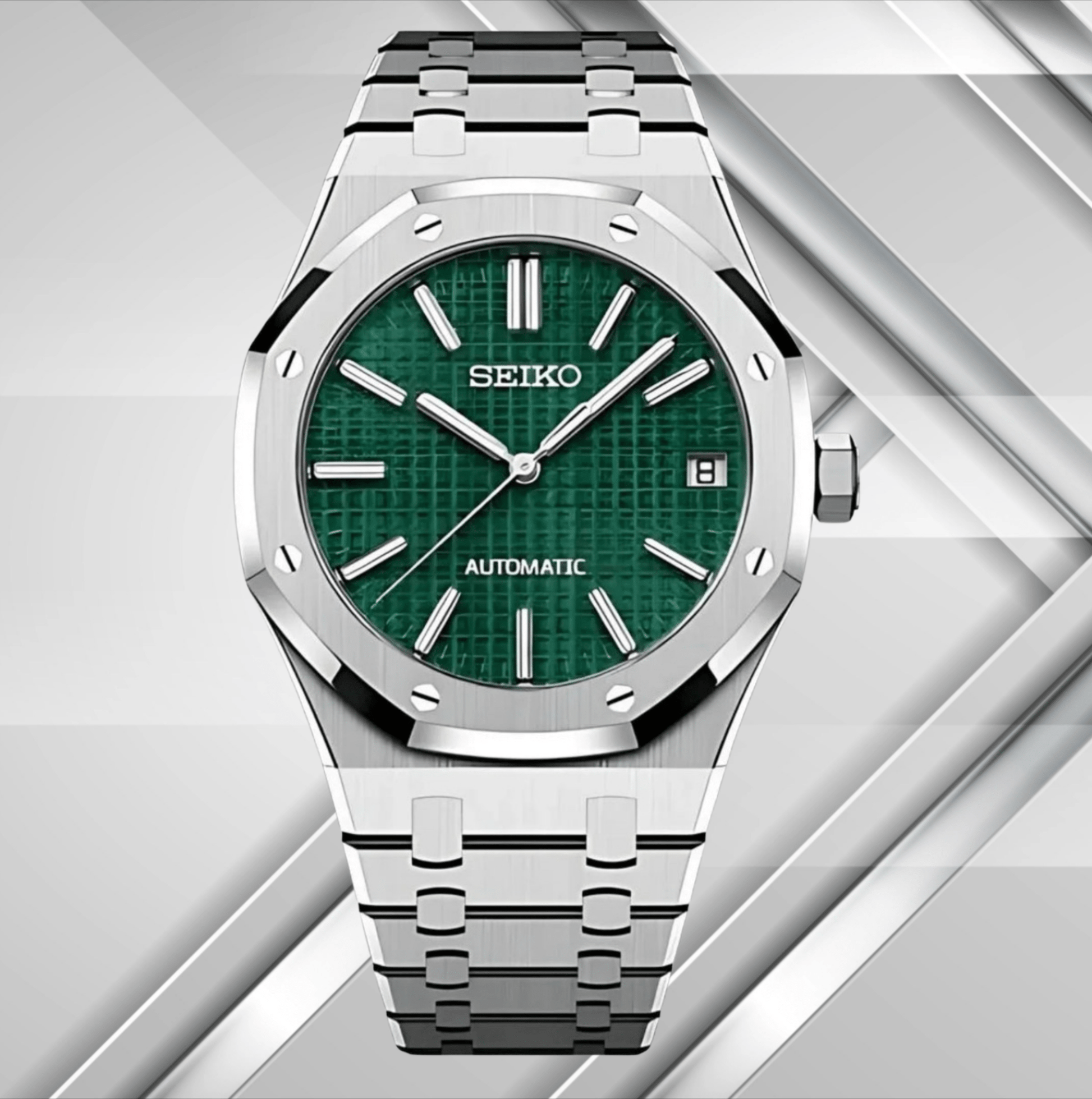 Introducing the Seiko Mod Royal Oak Green, a custom Seiko NH35 Automatic Watch inspired by the iconic Royal Oak design, meticulously crafted for those who seek elegance and precision. This model features a Green aftermarket dial and a transparent back piece, allowing a glimpse into the intricate automatic movement.