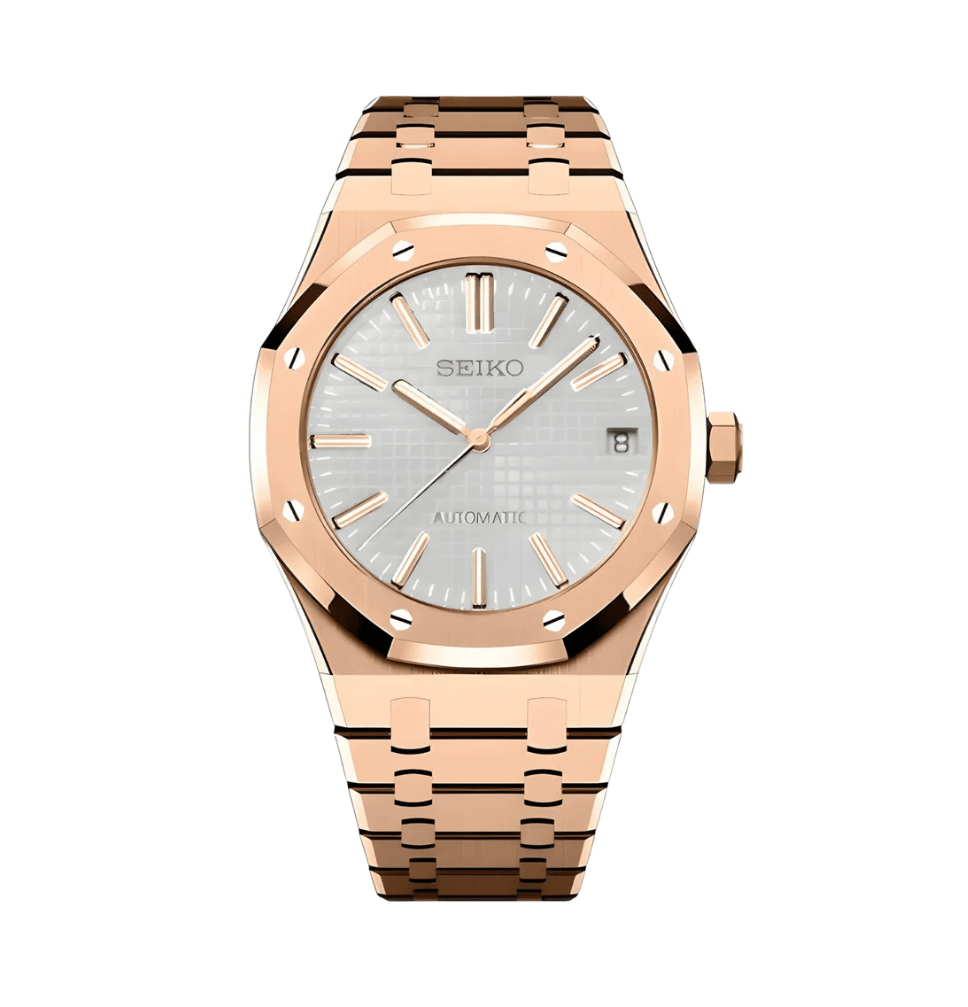 Introducing the Seiko Mod Royal Oak Rose Gold - White, a custom Seiko NH35 Automatic Watch inspired by the iconic Royal Oak design, meticulously crafted for those who seek elegance and precision. This model features a White aftermarket dial and a transparent back piece, allowing a glimpse into the intricate automatic movement.
