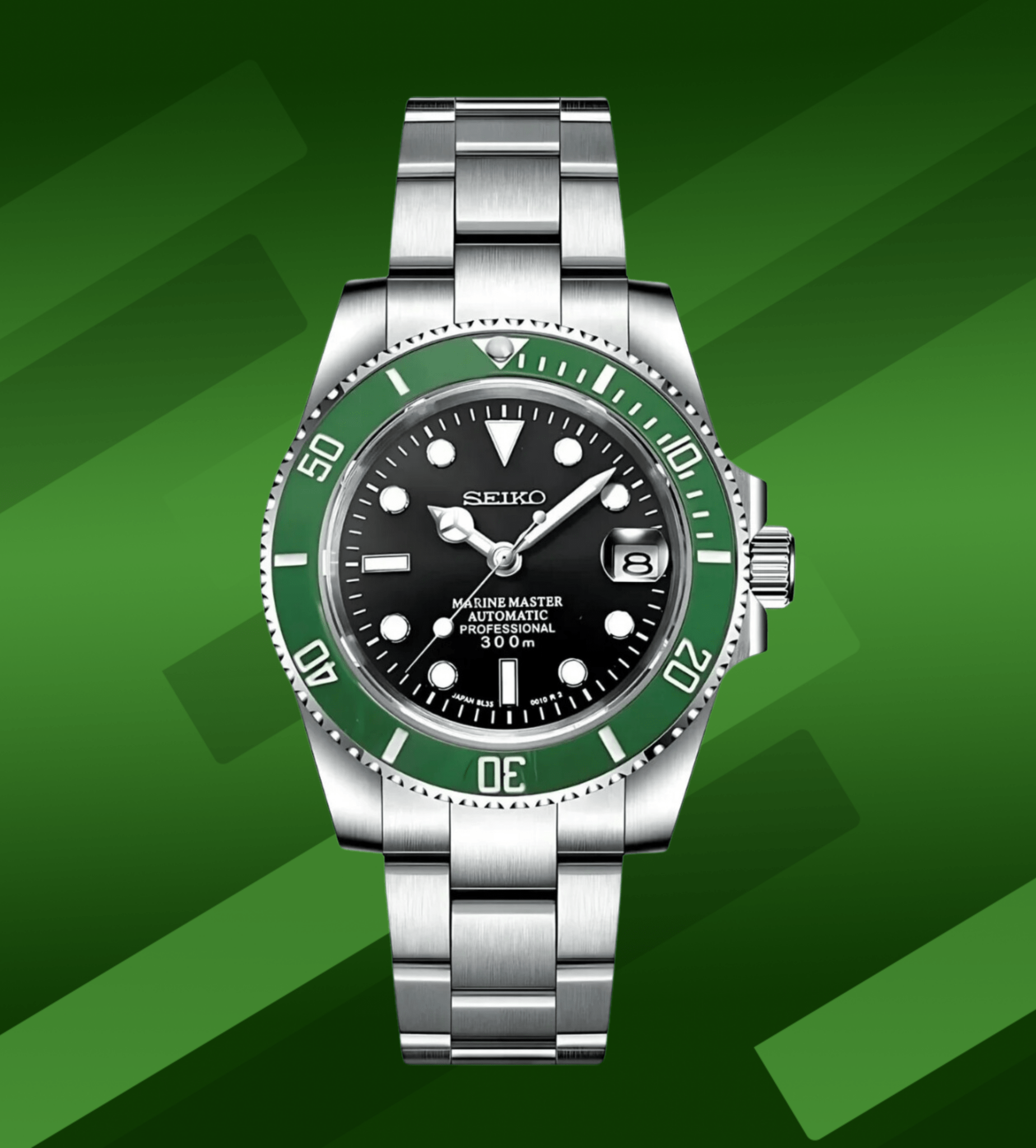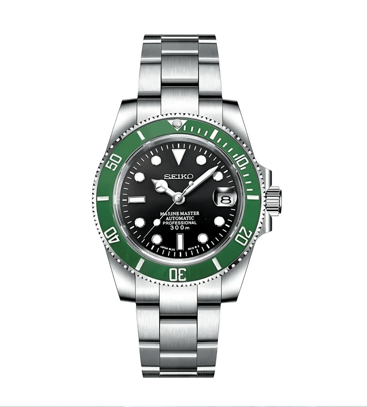 Introducing the Seiko Mod Submariner Kermit, a custom Seiko NH35 Automatic Watch inspired by the iconic Submariner, meticulously crafted for watch enthusiasts seeking uniqueness and precision. This mode features a Kermit dial and a transparent back piece, allowing a glimpse into the intricate automatic movement.