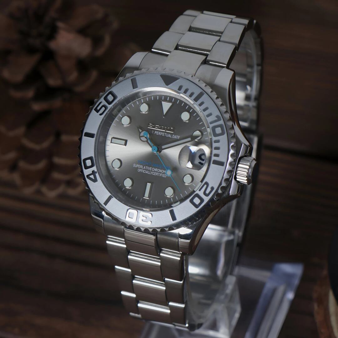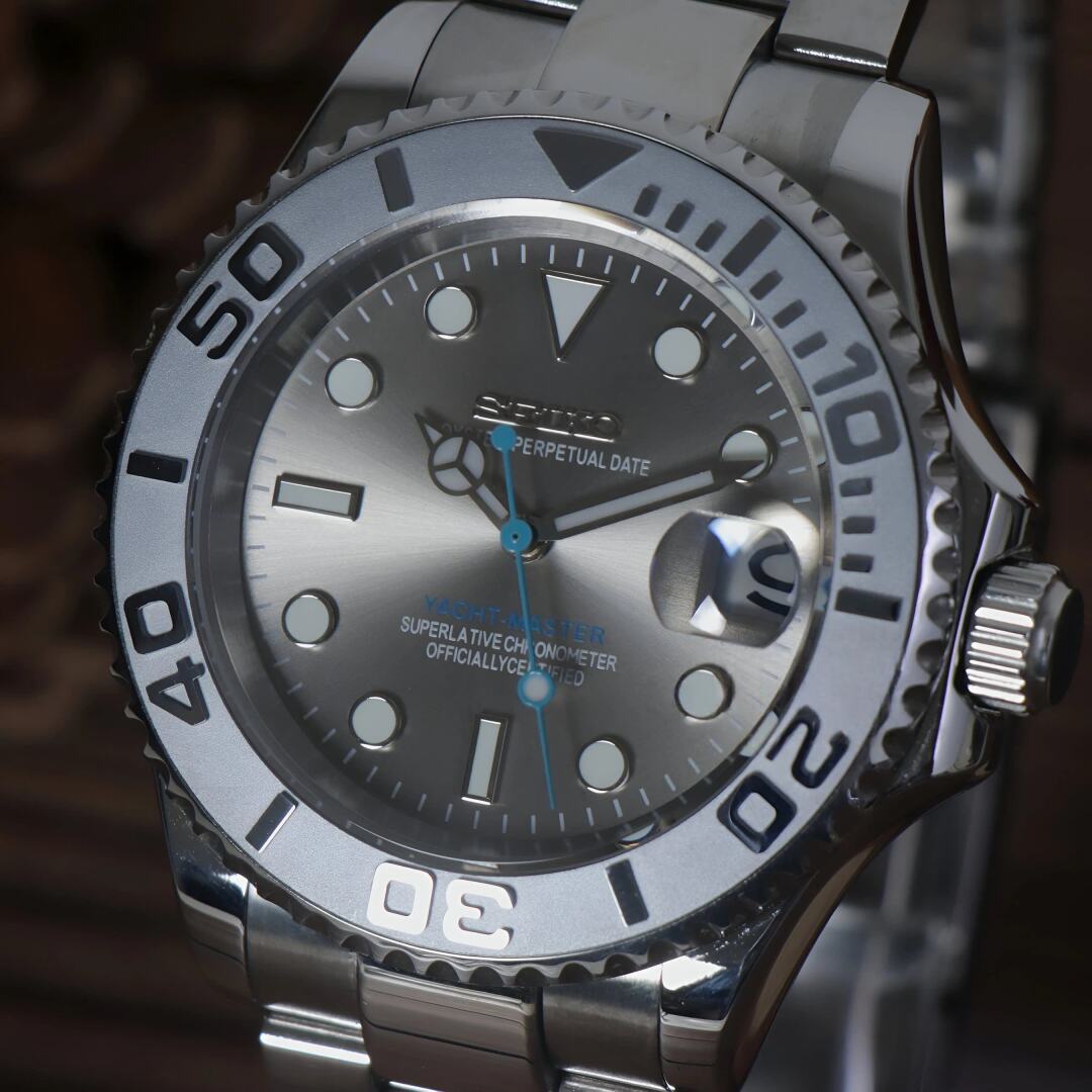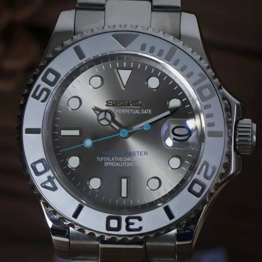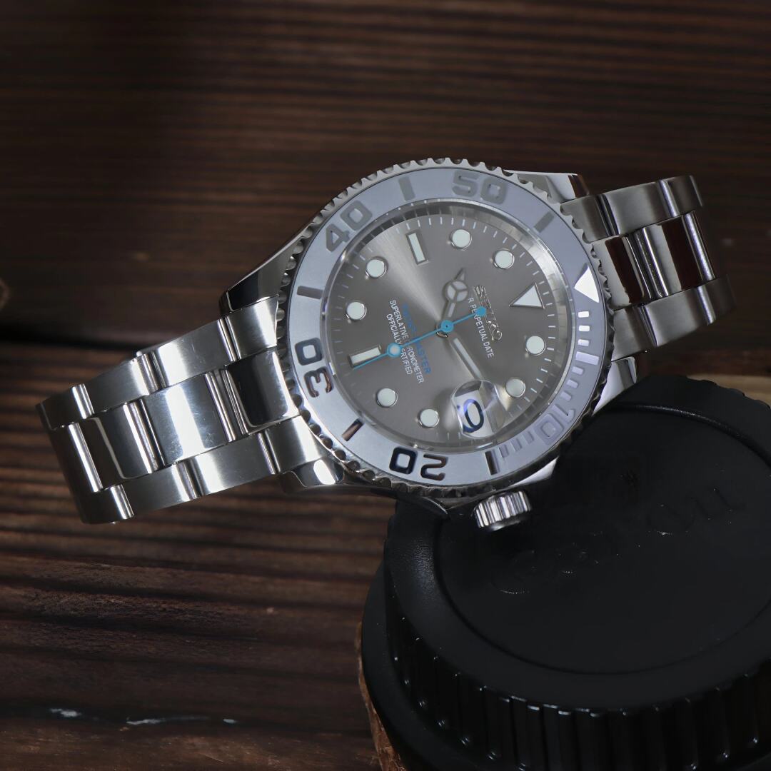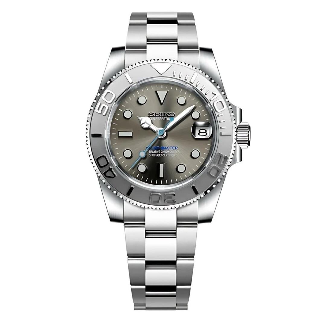 Introducing Seiko Mod Submariner Grey a custom Seiko NH35 Automatic Watch inspired by the iconic Submariner Pepsi, meticulously crafted for watch enthusiasts seeking uniqueness and precision. This mode features a Submariner Black aftermarket dial and a transparent back piece, allowing a glimpse into the intricate automatic movement.