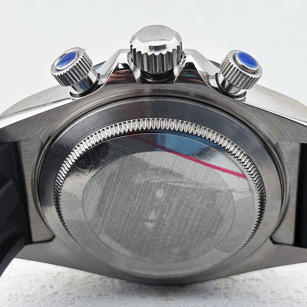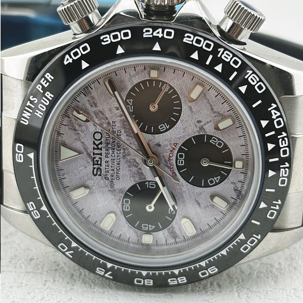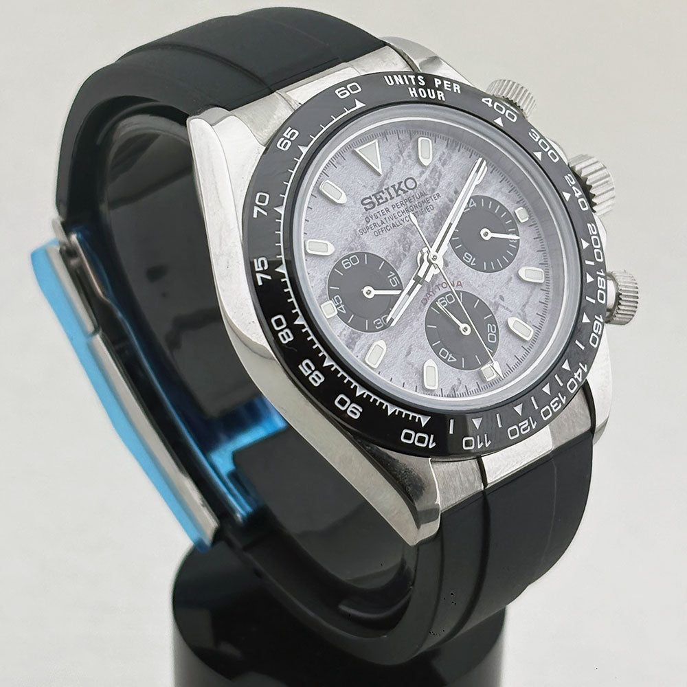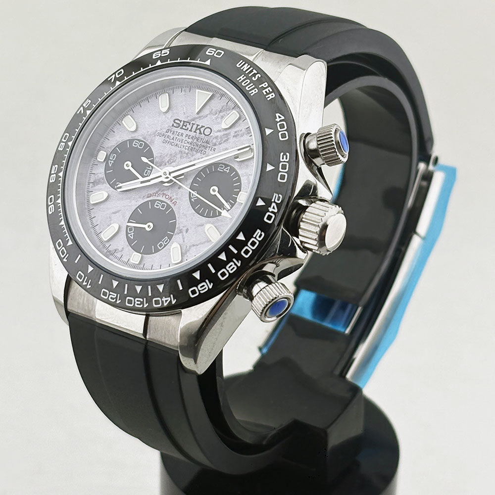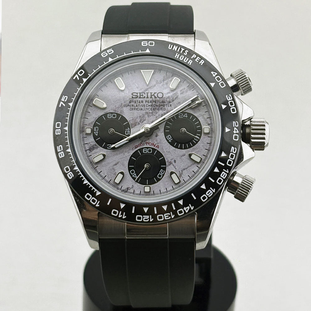 Elevate your style with the Daytona Black meteorite , a custom Seiko VK63 Mechanical Quartz Watch, inspired by the iconic “Daytona” design. This unique timepiece features a Black Ceramic dial, encased in a 40mm stainless steel frame, offering a blend of elegance and precision for watch enthusiasts.