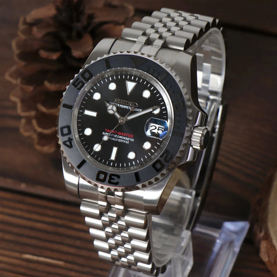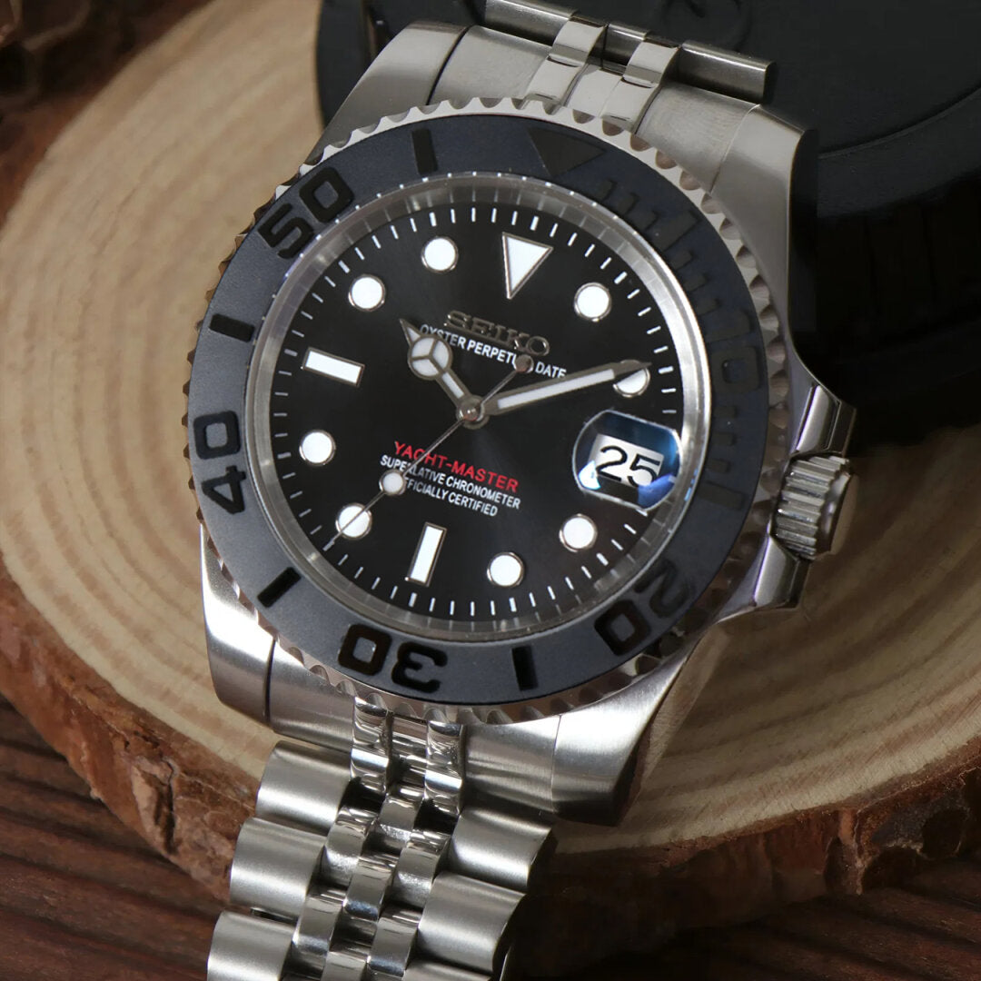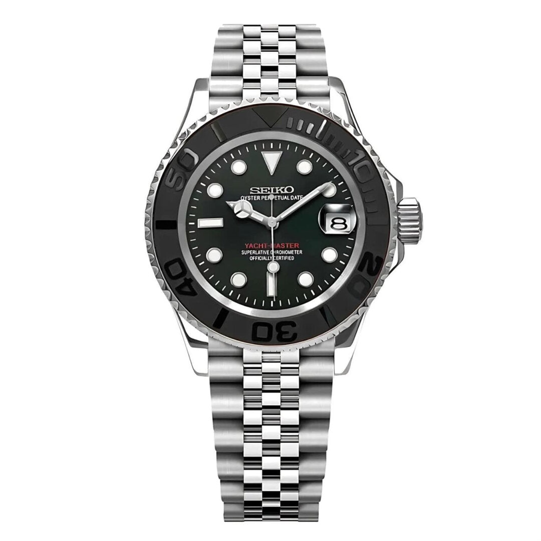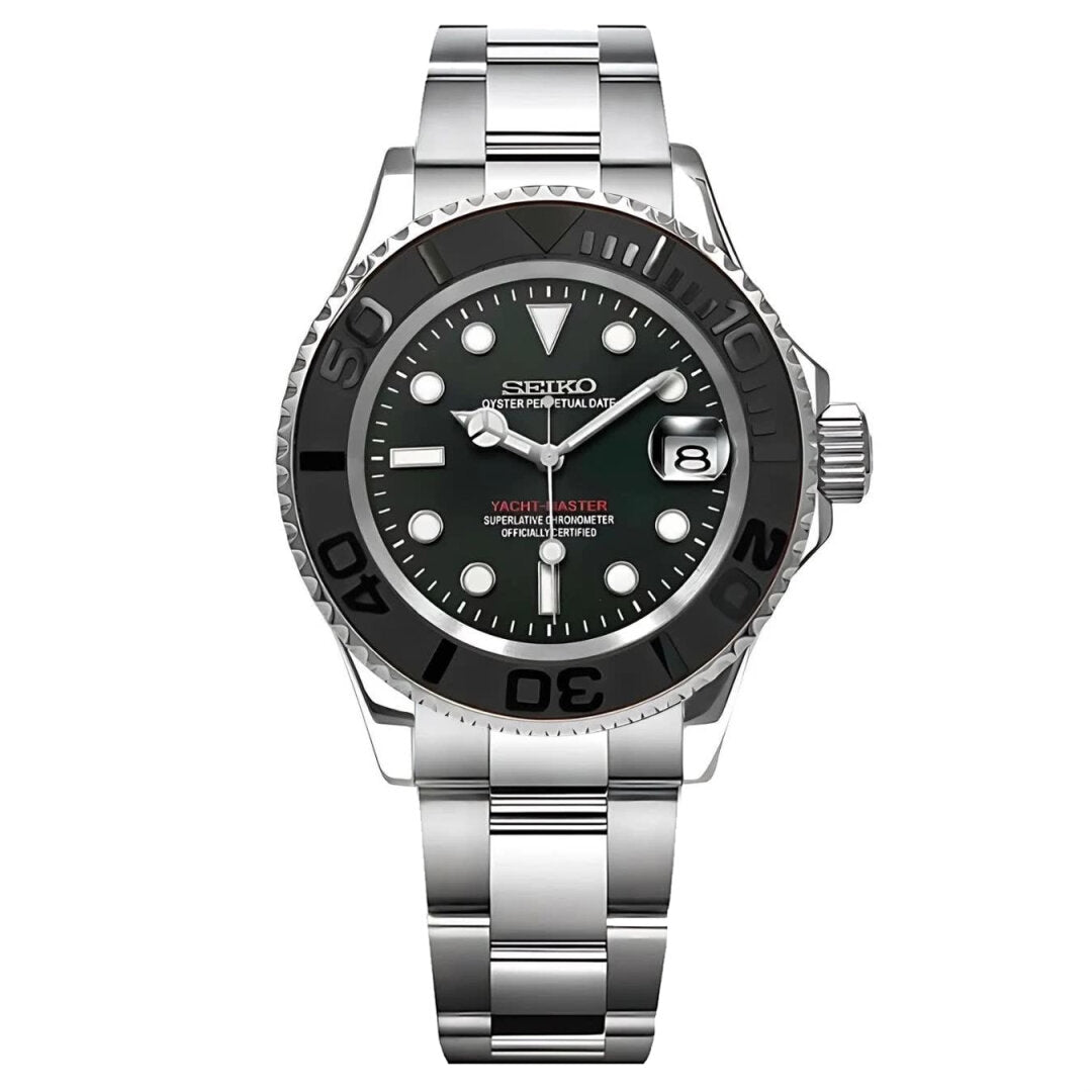 Introducing the Seiko Mod Submariner Sliver Black , a custom Seiko NH35 Automatic Watch inspired by the iconic Submariner Blue Black, meticulously crafted for watch enthusiasts seeking uniqueness and precision. This mode features a Blue Black dial and a transparent back piece, allowing a glimpse into the intricate automatic movement.