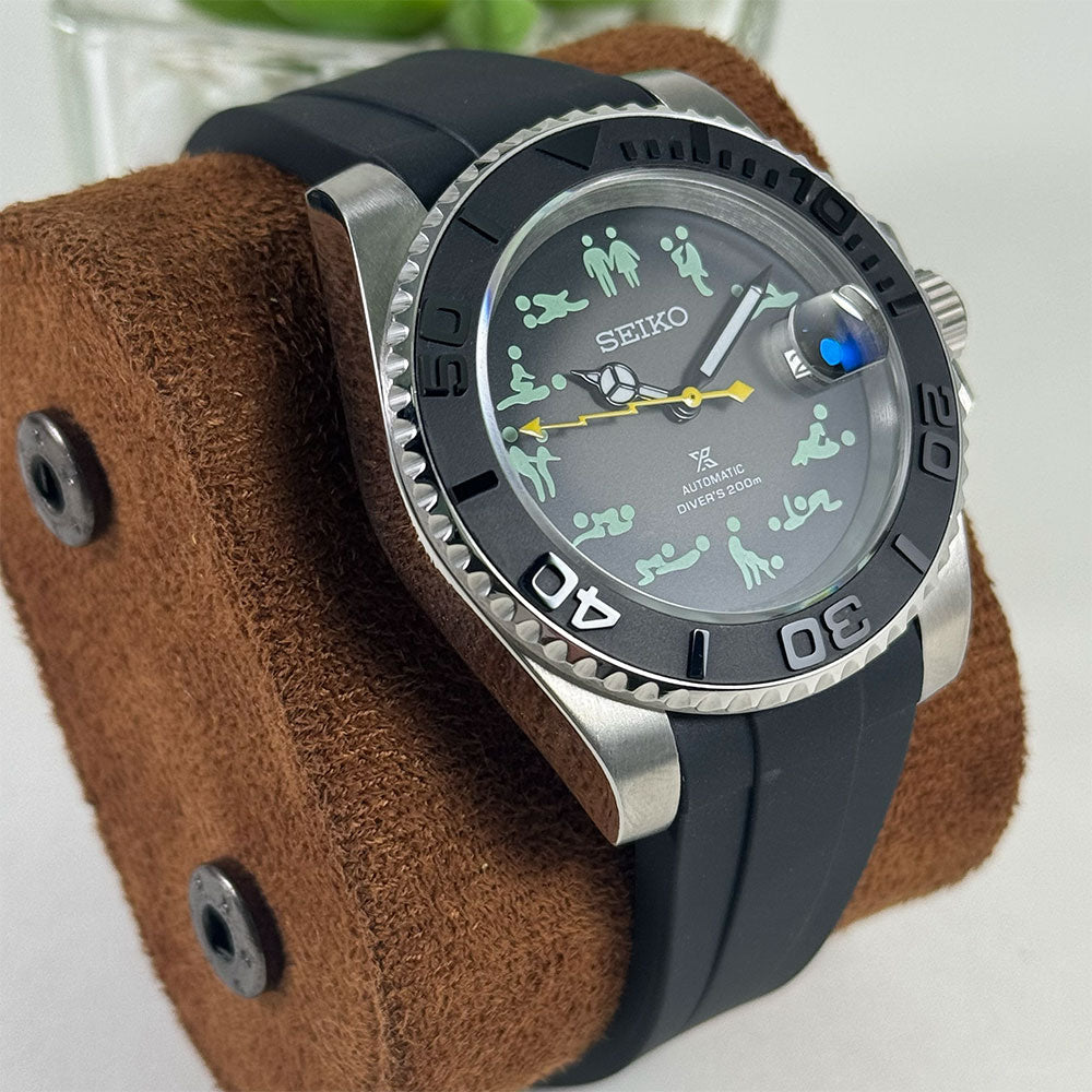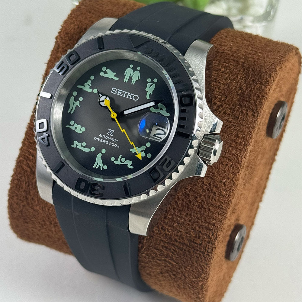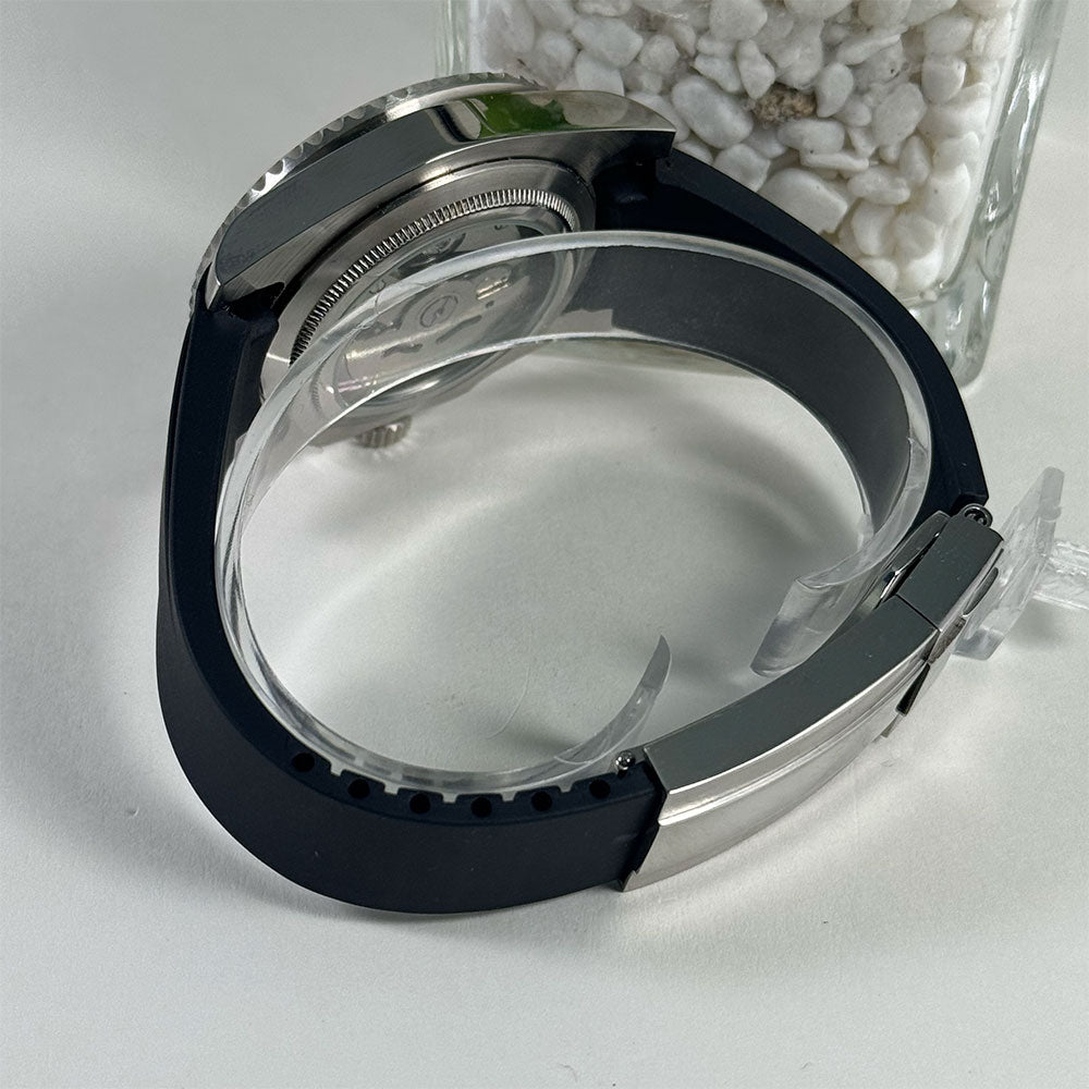Introducing the SeikoMod Submariner Funny position , a custom Seiko NH35 Automatic Watch inspired by the iconic Submariner, meticulously crafted for watch enthusiasts seeking uniqueness and precision. This mode features a Black dial and a transparent back piece, allowing a glimpse into the intricate automatic movement.